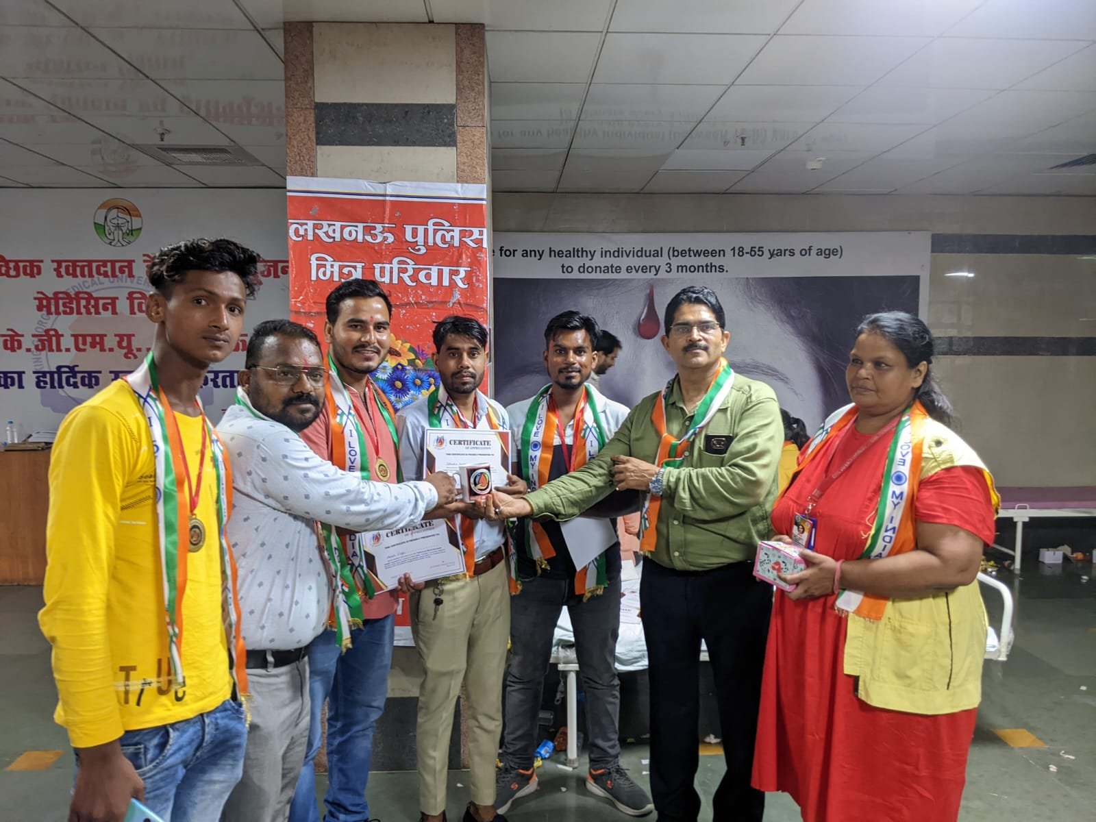 लखनऊ । स्वतंत्रता दिवस के उपलक्ष्य मे आयोजित लखनऊ पुलिस मित्र परिवार द्वारा आयोजित रक्तदान शिविर मे 80 लोगों में कुल 50 लोगों ने सफलतापूर्वक रक्तदान किया। किंग जॉर्ज मेडिकल कॉलेज लखनऊ मे आयोजित इस कार्यक्रम मे मुख्य अतिथि ट्रामा सेन्टर प्रमुख संदीप तिवारी रहे। उन्होंने कहा रक्तदान से शरीर को कई फायदे मिलते है।